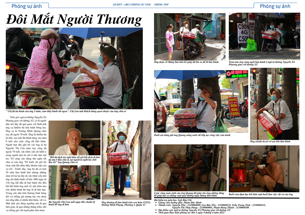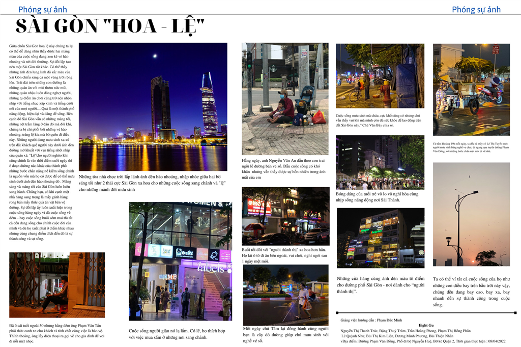 Với phương châm “Học là trải nghiệm thực tiễn”, Triển lãm là nơi để chia sẻ các tác phẩm ảnh báo chí của các bạn sinh viên về cuộc sống xung quanh. Gần 20 bộ ảnh được triển lãm là 20 góc nhìn khác nhau được góp nhặt từ những câu chuyện sinh động, chân thực về cuộc đời mưu sinh của những người lao động nghèo tại Sài Gòn. Một số tác phẩm còn khai thác những đề tài mới mẻ hơn như việc chăm nuôi thú cưng hay làm tượng Phật bằng gỗ.
