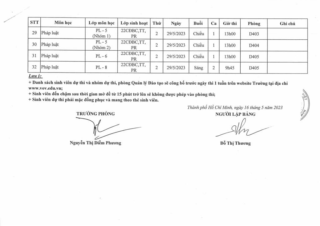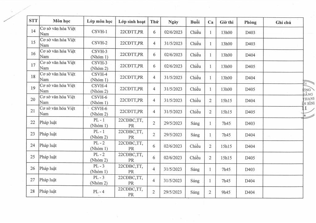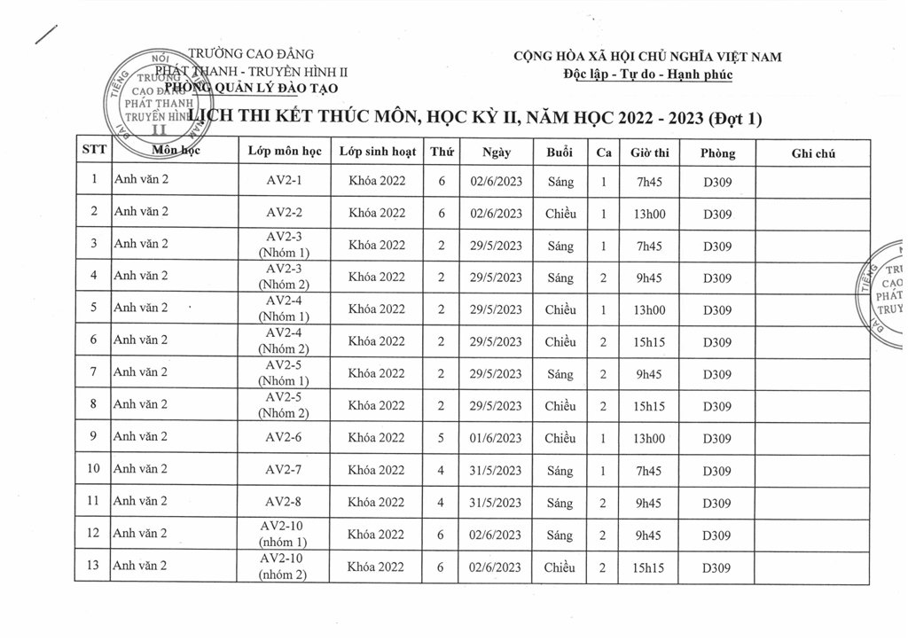 LỊCH THI KẾT THÚC MÔN, HỌC KỲ II, NH 2022 - 2023 (ĐỢT 1)