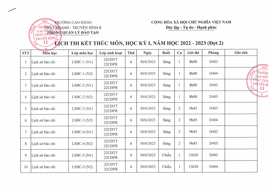 LỊCH THI KẾT THÚC MÔN, HỌC KỲ II, NH 2022 - 2023 (ĐỢT 2)