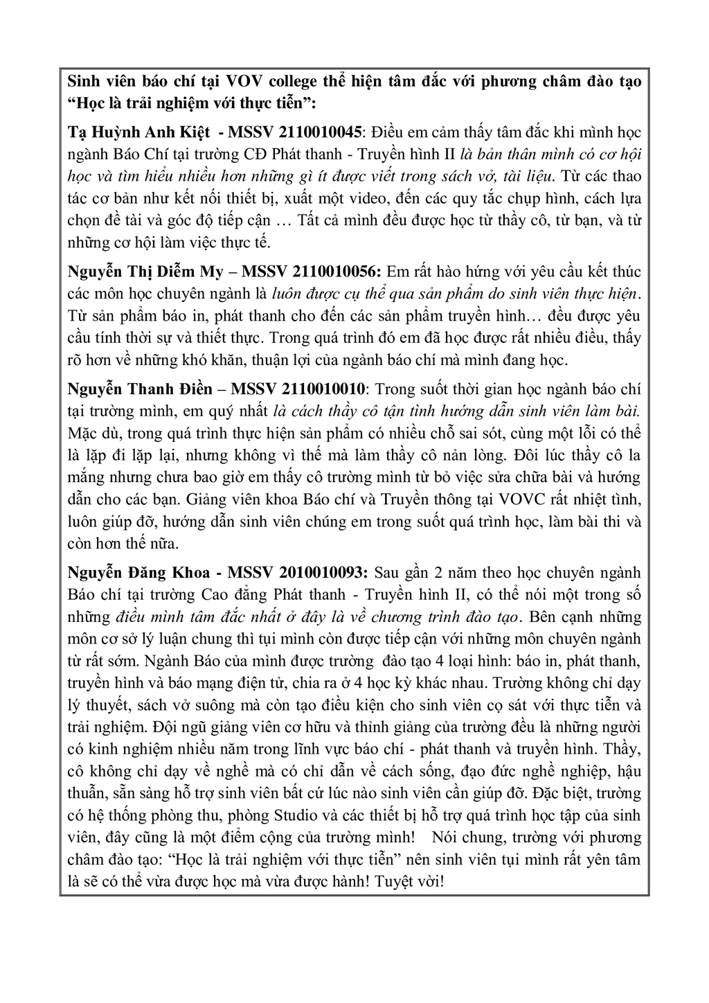 Từ năm 2012, nhà trường chuyển đổi dần hình thức thi kết môn dần sang hình thức thực hiện sản phẩm kết môn cho tất cả các học phần chuyên ngành báo chí, bắt đầu thời kỳ đào tạo với phương châm “Học là trải nghiệm với Thực tiễn”. Sinh viên thực hiện các sản phẩm báo chí theo mô hình ekip sản xuất từ bản tin phát thanh, bản tin truyền hình, câu chuyện truyền thanh, tọa đàm phát thanh cho đến chương trình phát thanh trực tiếp, chương trình truyền hình trực tiếp… Nhờ đó, sinh viên có điều kiện học tập và rèn luyện ở các vị trí công việc của một phóng viên, biên tập viên, kỹ thuật, đạo diễn, quay phim, MC – người dẫn chương trình, thư ký trường quay… Đây chính là nền tảng để các sinh viên báo chí tại VOV college có thể đáp ứng nhanh các yêu cầu và vị trí công việc khi ra trường ở các cơ quan báo chí, truyền thông.