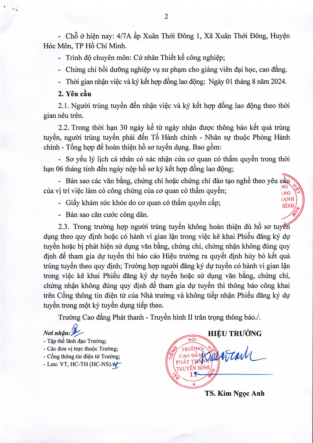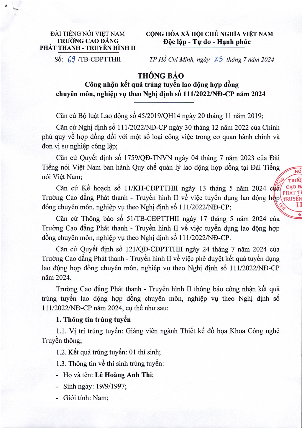 Thông báo công nhận kết quả trúng tuyển lao động hợp đồng chuyên môn, nghiệp vụ theo Nghị định số 111/2022/NĐ-CP năm 2024