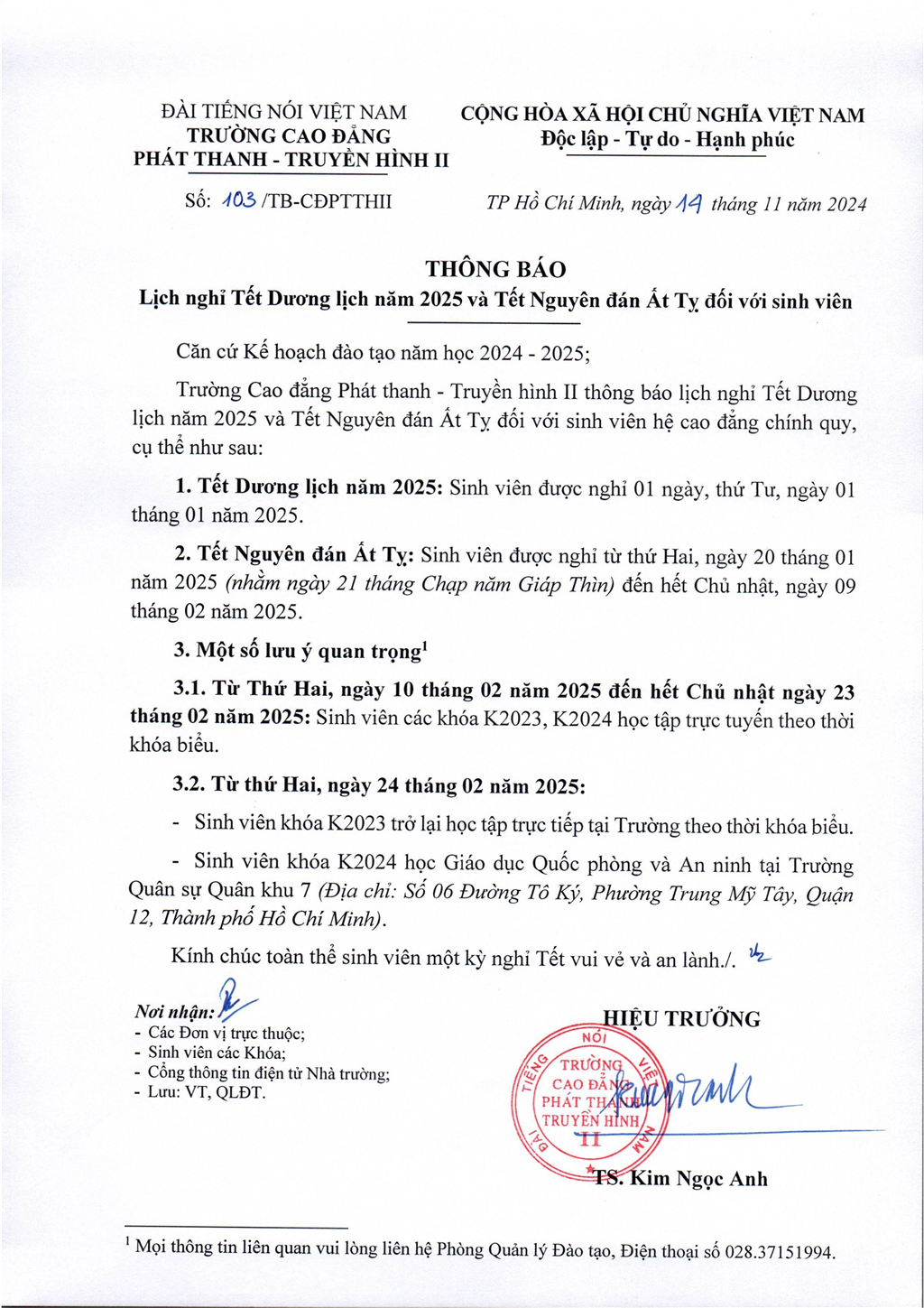 Thông báo lịch nghỉ Tết dương lịch năm 2025 và Tết Nguyên đán Ất Tỵ đối với sinh viên
