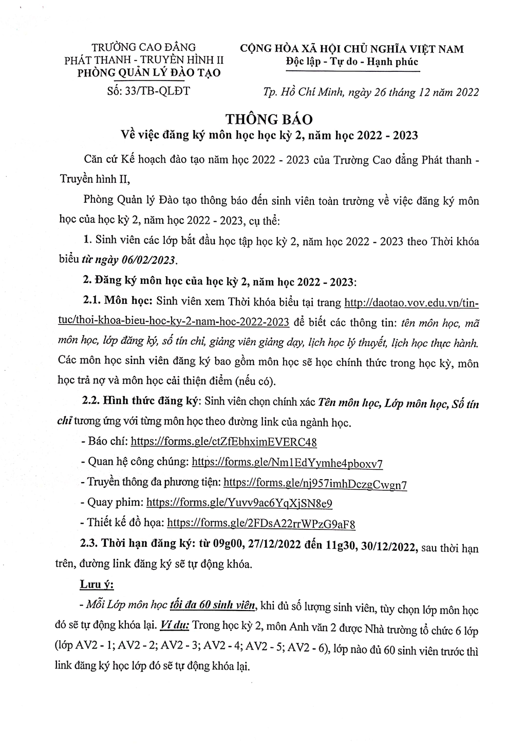26/12/2022 Căn cứ Kế hoạch đào tạo năm học 2022 - 2023 của Trường Cao đẳng Phát thanh - Truyền hình II,