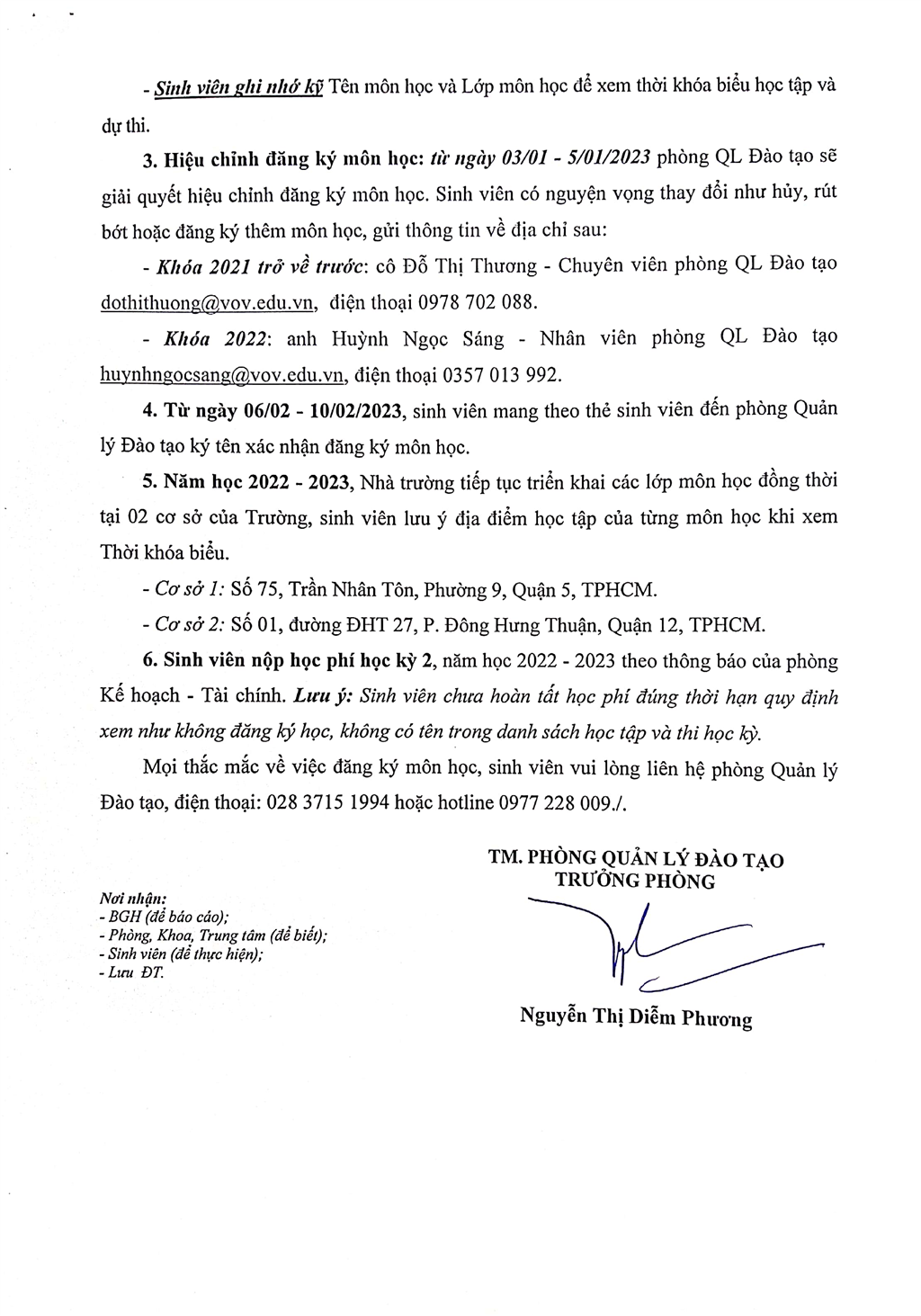 - Khóa 2022: anh Huỳnh Ngọc Sáng - Nhân viên phòng QL Đào tạo huynhngocsang@vov.edu.vn, điện thoại 0357 013 992.