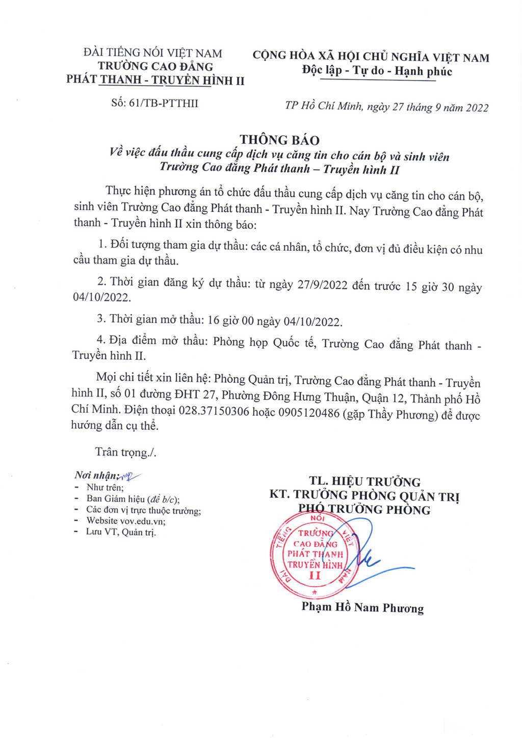 Thông báo về việc đấu thầu cung cấp dịch vụ căng tin cho cán bộ và sinh viên Trường Cao đẳng Phát thanh - Truyền hình II