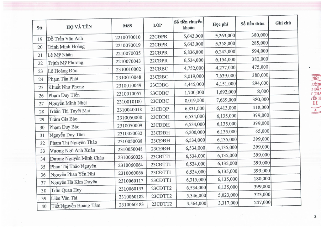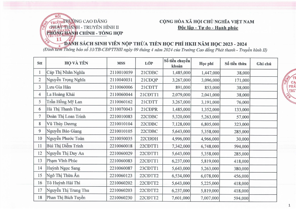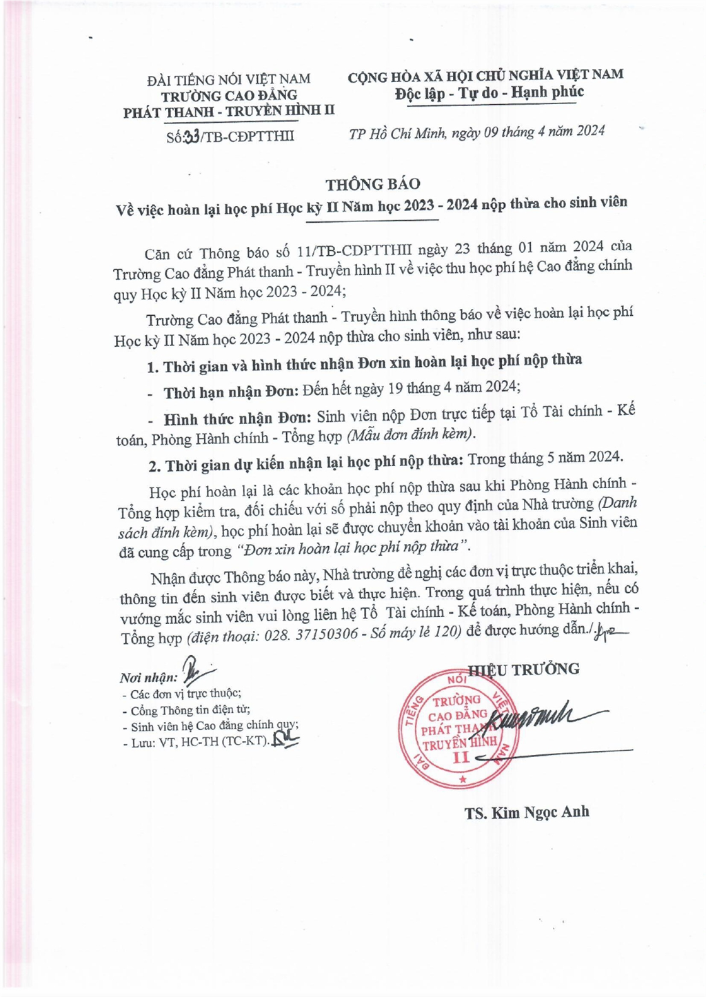Thông báo về việc hoàn lại học phí Học kỳ II năm học 2023-2024 nộp thừa cho sinh viên