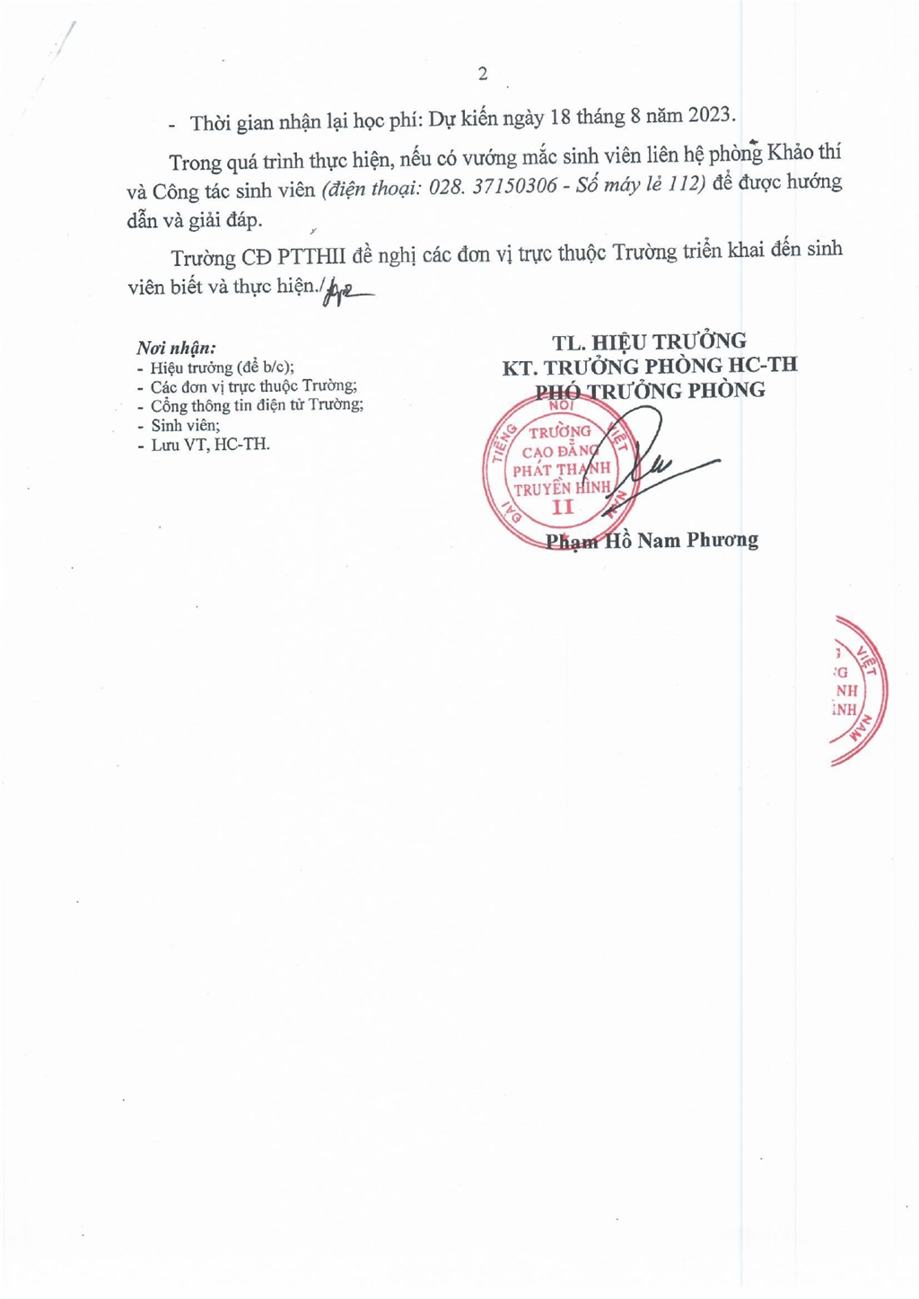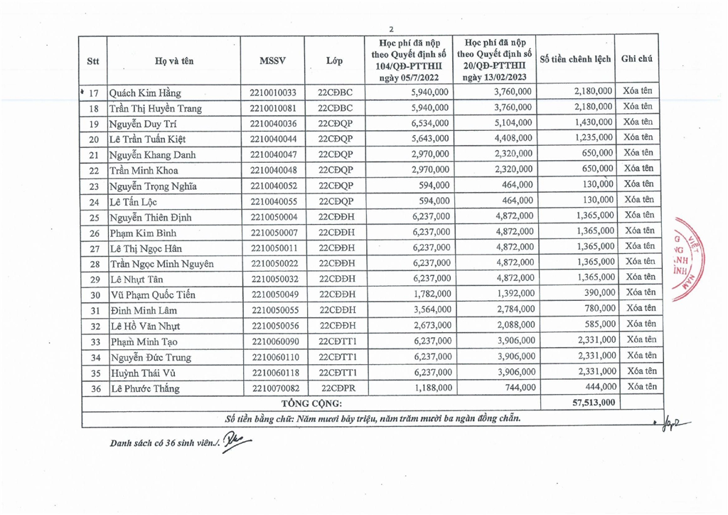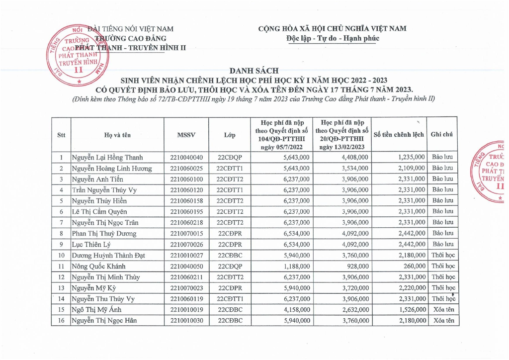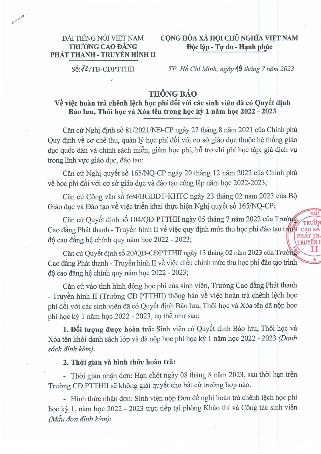 Thông báo về việc hoàn trả chênh lệch học phí đối với các sinh viên đã có quyết định Bảo lưu, Thôi học và Xóa tên trong học kỳ 1 năm học 2022-2023