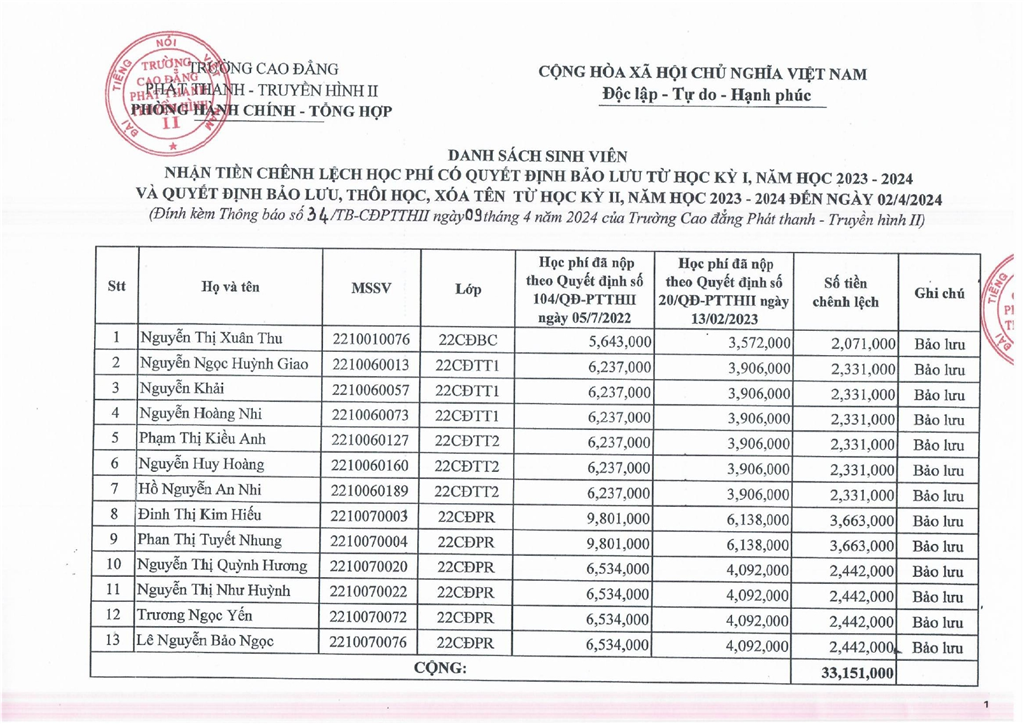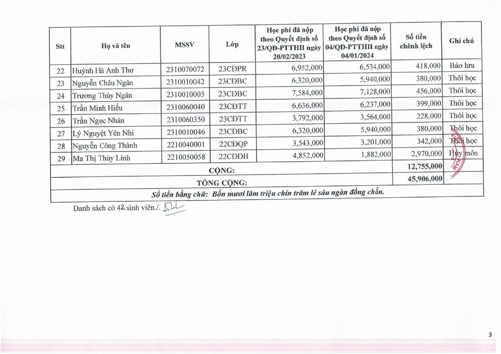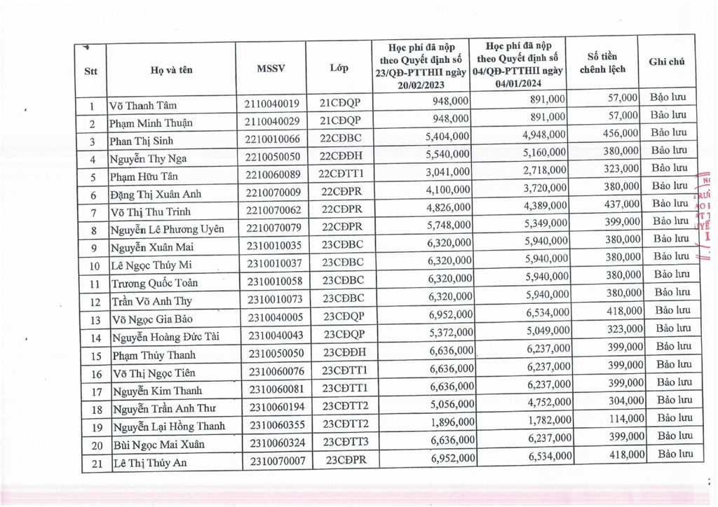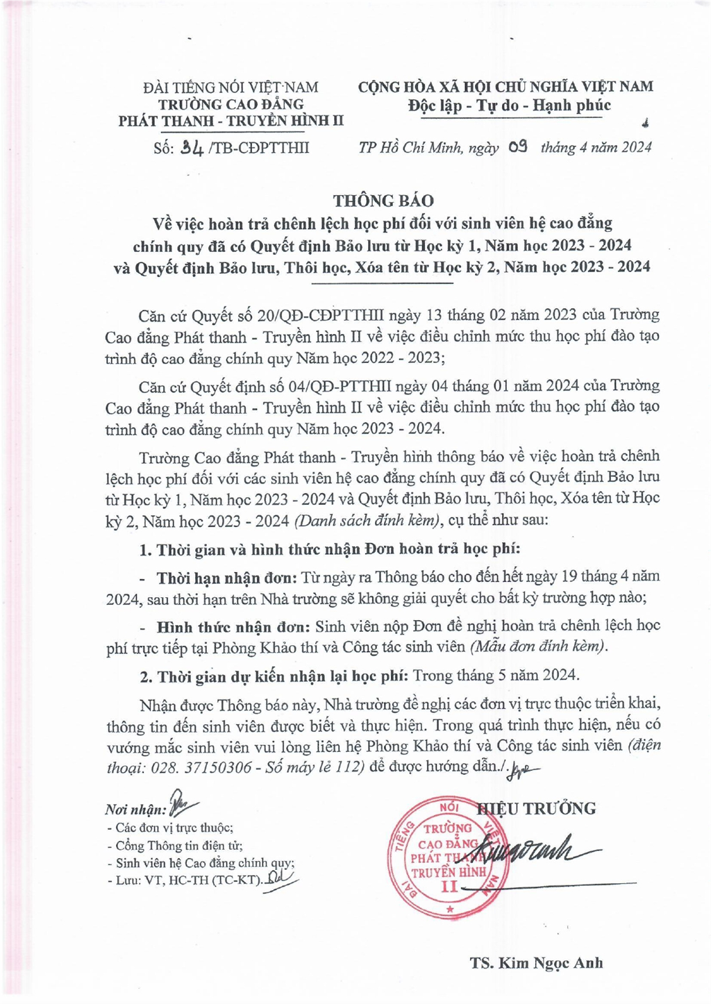 Thông báo về việc hoàn trả chênh lệch học phí đối với sinh viên hệ Cao đẳng chính quy đã có Quyết định Bảo lưu từ Học kỳ 1, năm học 2023-2024 và Quyết định Bảo lưu, Thôi học, Xóa tên từ Học kỳ 2, năm học 2023-2024