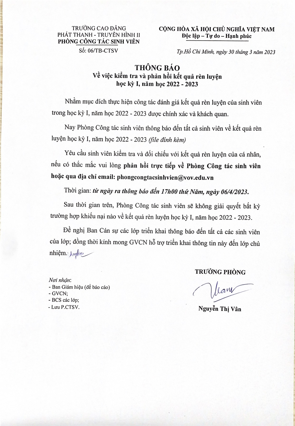 Thông báo Về việc kiểm tra và phản hồi kết quả rèn luyện học kỳ II, năm học 2022 - 2023