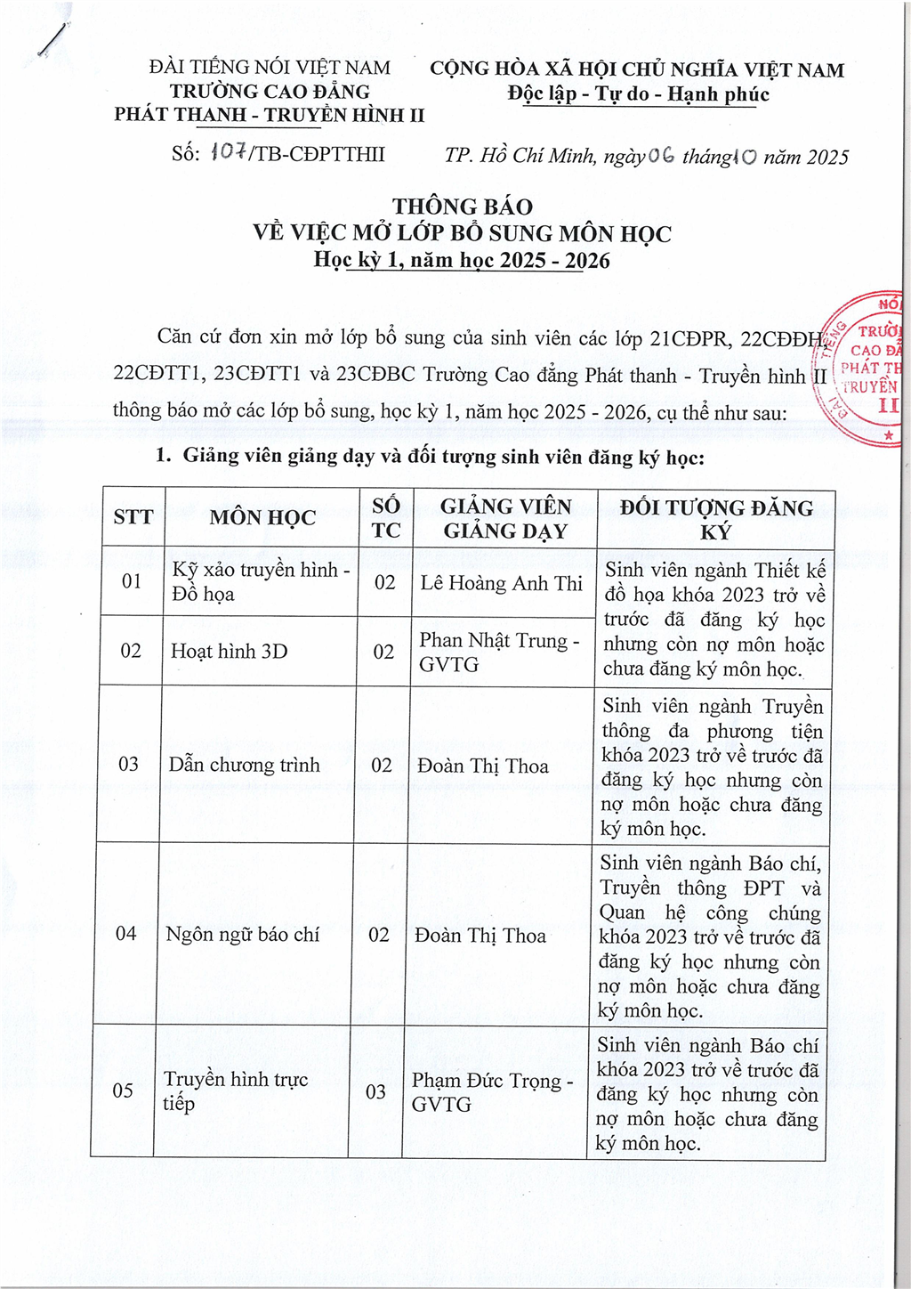 Thông báo về việc mở lớp bổ sung môn học học kỳ 1, năm học 2025-2026