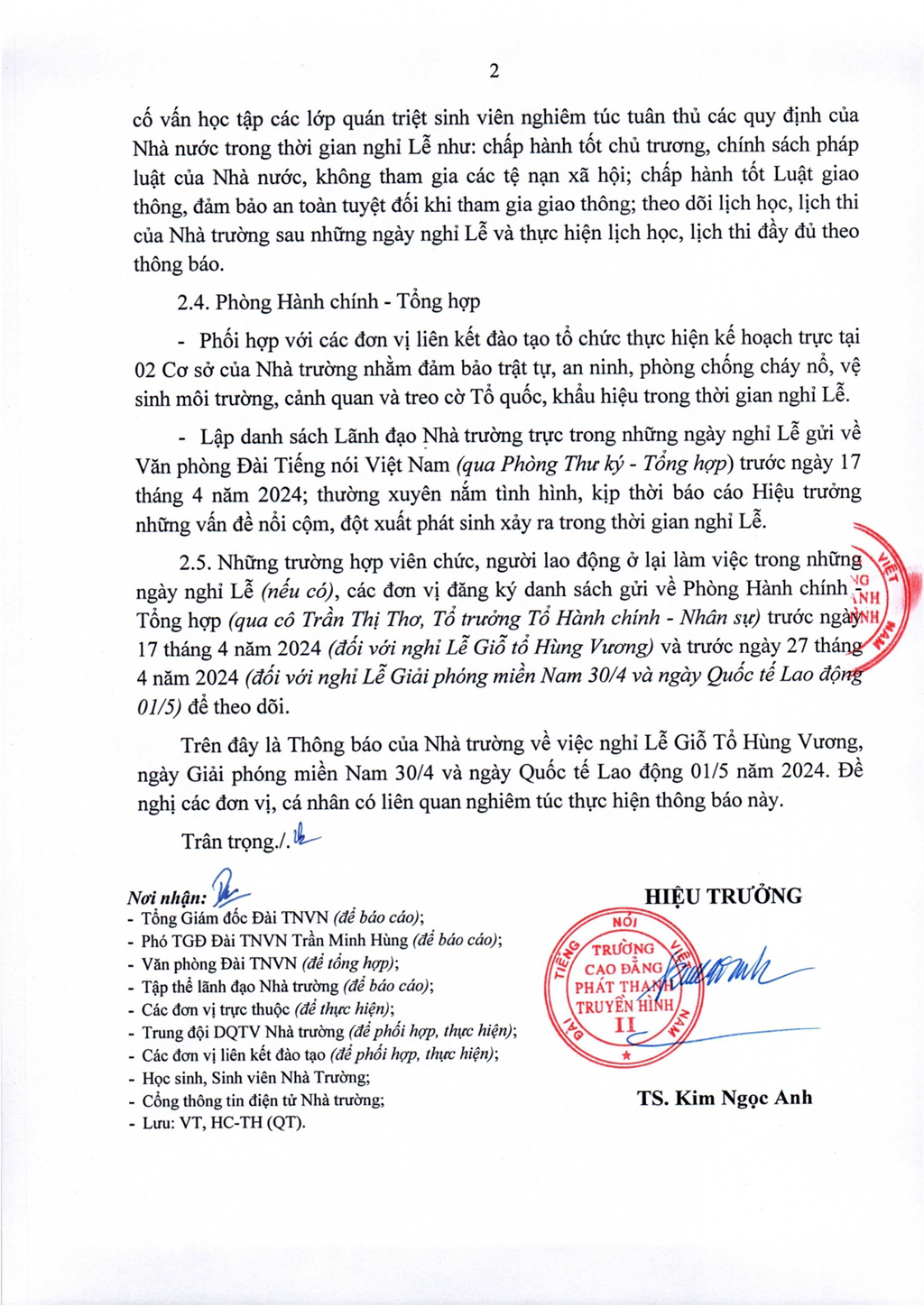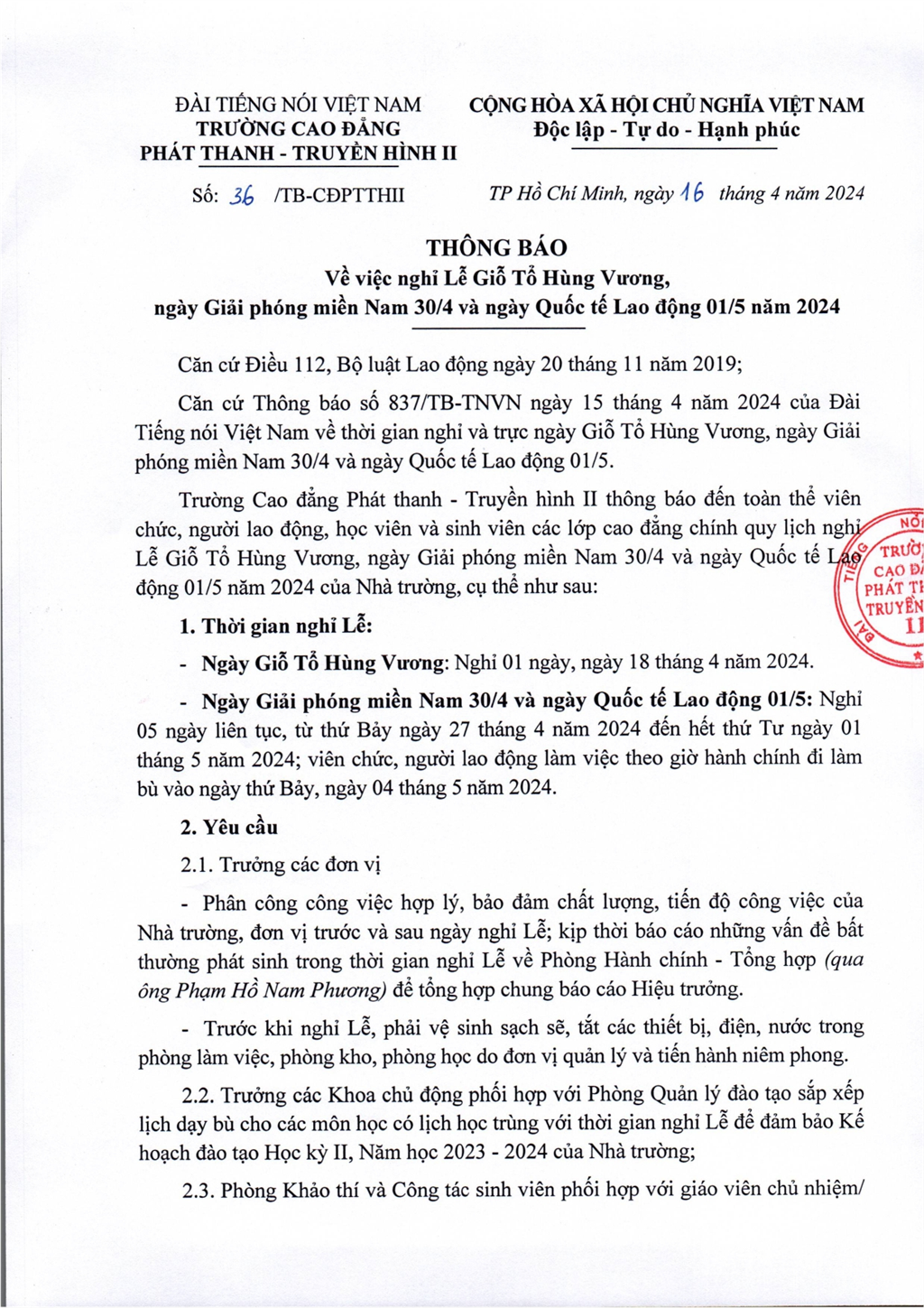 Thông báo về việc nghỉ Lễ Giỗ Tổ Hùng Vương, ngày Giải phóng miền Nam 30/4 và ngày Quốc tế Lao động 01/5 năm 2024