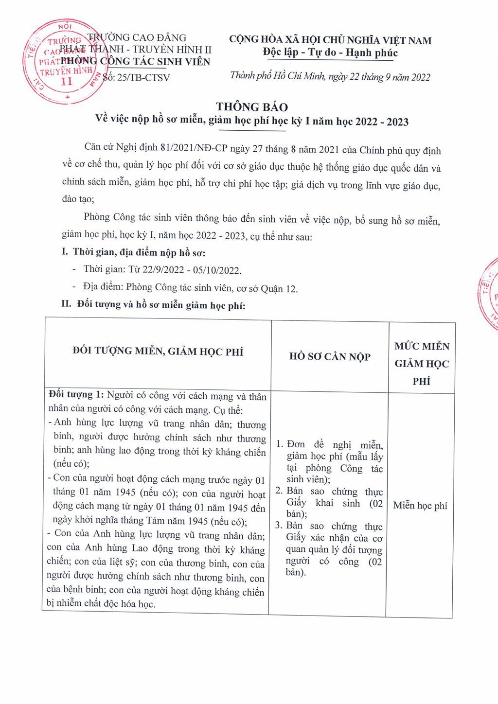 Thông báo về việc nộp hồ sơ miễn giảm học phí học ky 1, năm học 2022 - 2023
