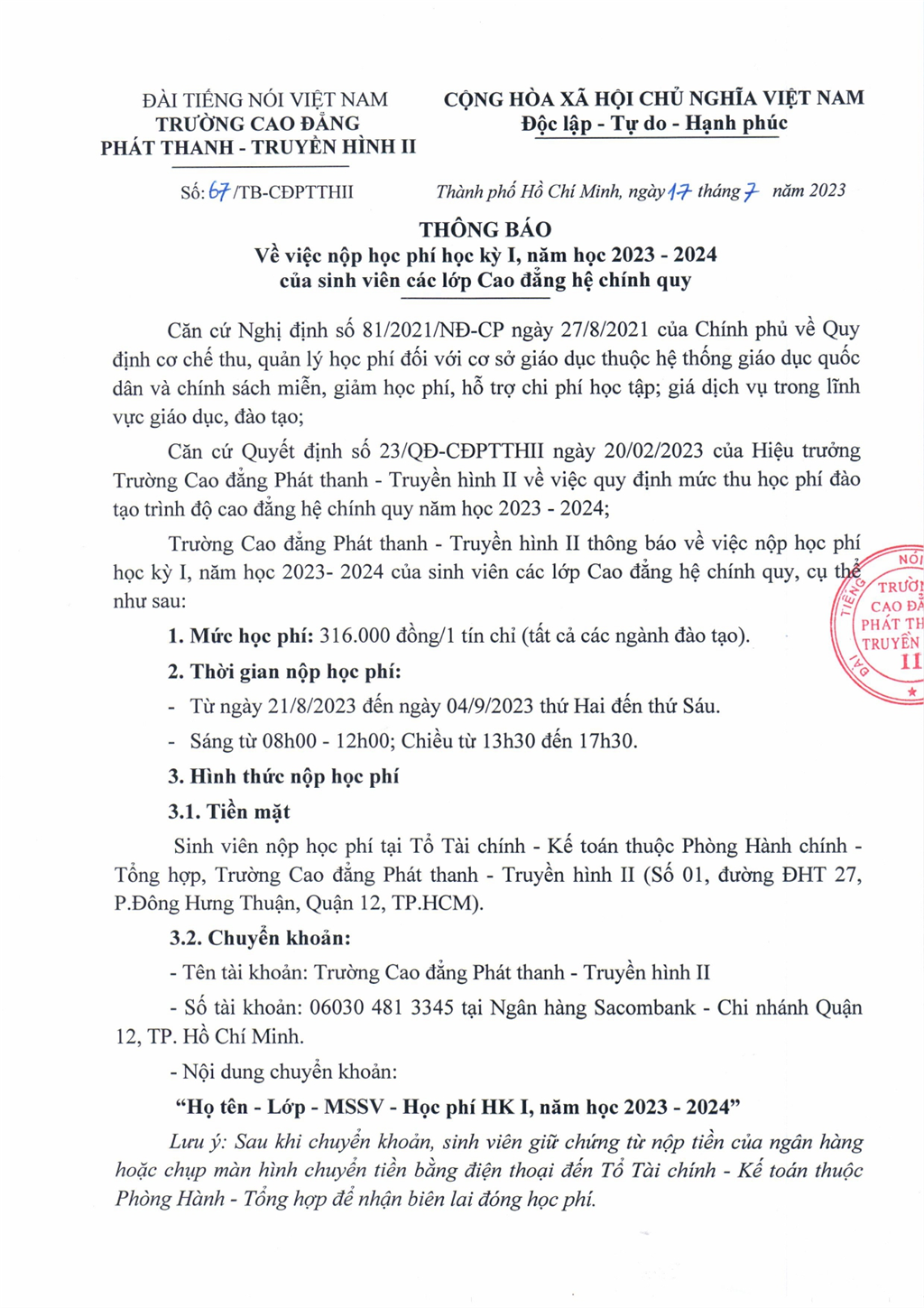 Thông báo về việc nộp học phí học kỳ I, năm học 2023 - 2024 của sinh viên các lớp cao đẳng hệ chính quy
