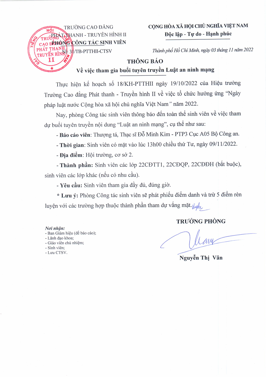 Thông báo về việc tham gia buổi tuyên truyền Luật an ninh mạng
