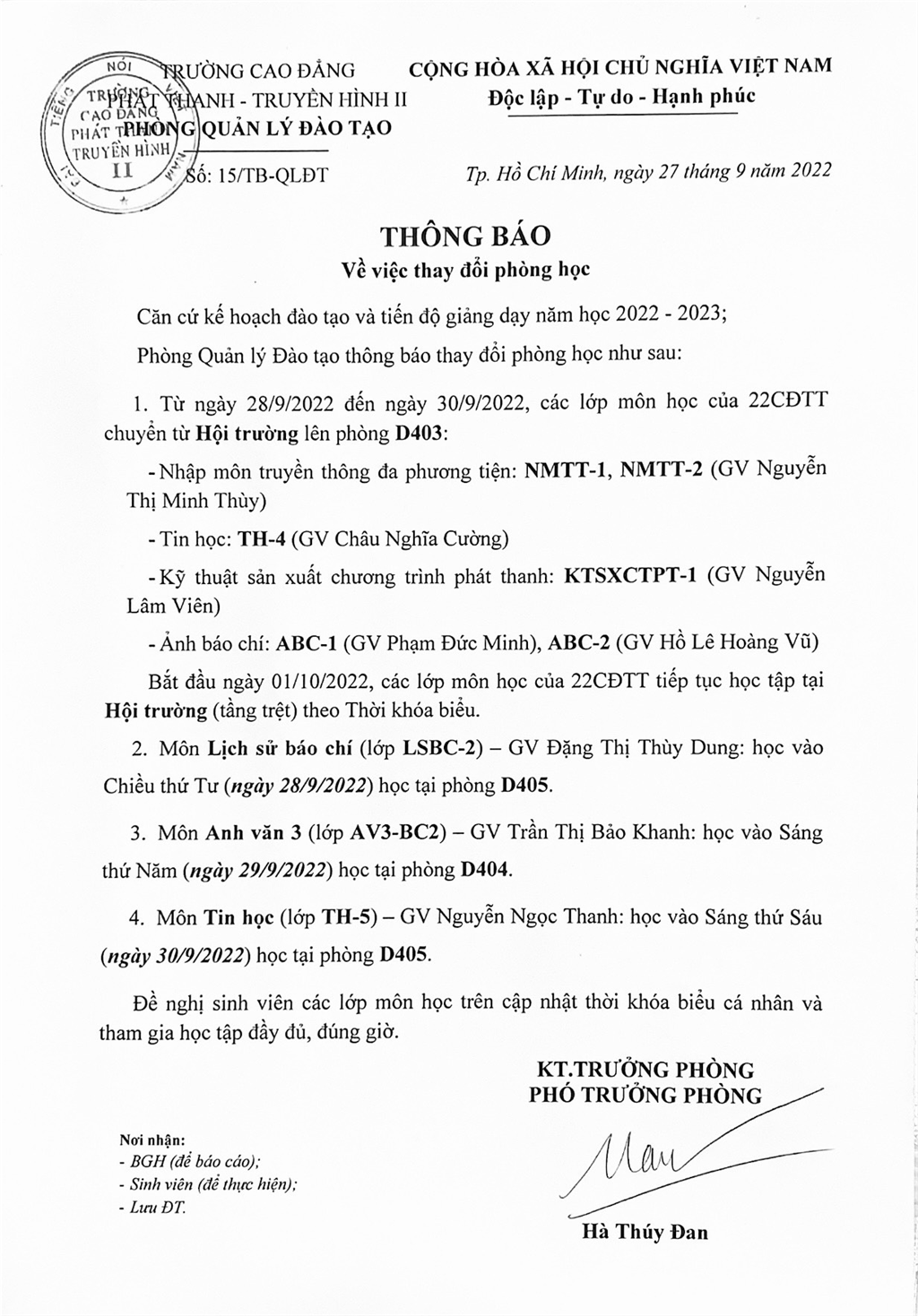 Thông báo về việc thay đổi phòng học
