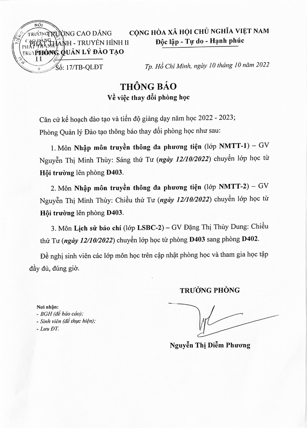 THÔNG BÁO VỀ VIỆC THAY ĐỔI PHÒNG HỌC
