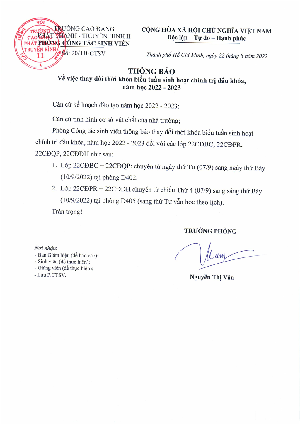 Thông báo về việc thay đổi thời khóa biểu tuần sinh hoạt chính trị đầu khóa, NH 2022 - 2023