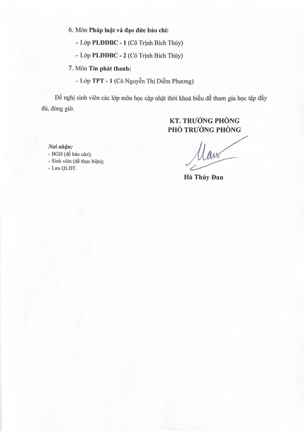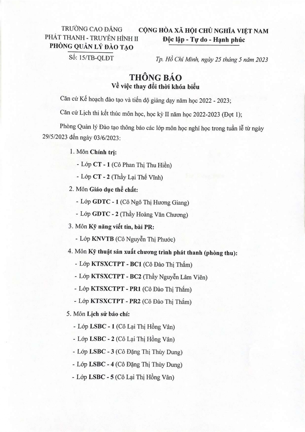 Thông báo về việc thay đổi thời khoá biểu