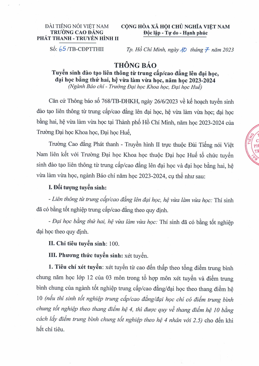 Quyết định về việc ban hành Quy chế tuyển sinh Cao đẳng chính quy áp dụng từ năm 2025 tại Trường Cao đẳng Phát thanh - Truyền hình II