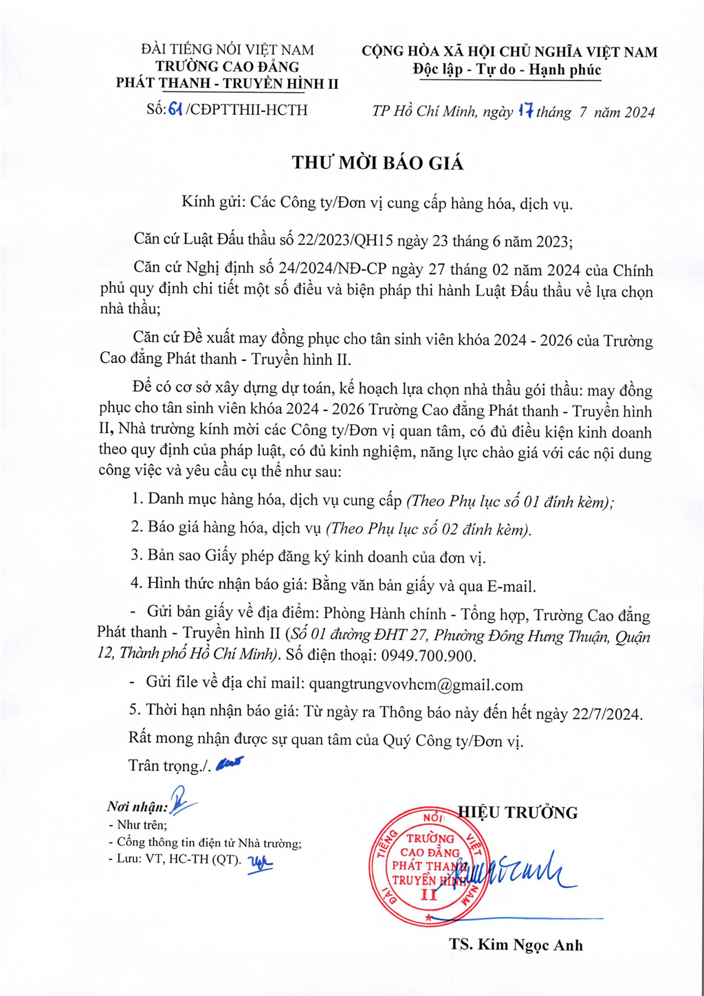 Thư mời báo giá về việc may đồng phục cho sinh viên
