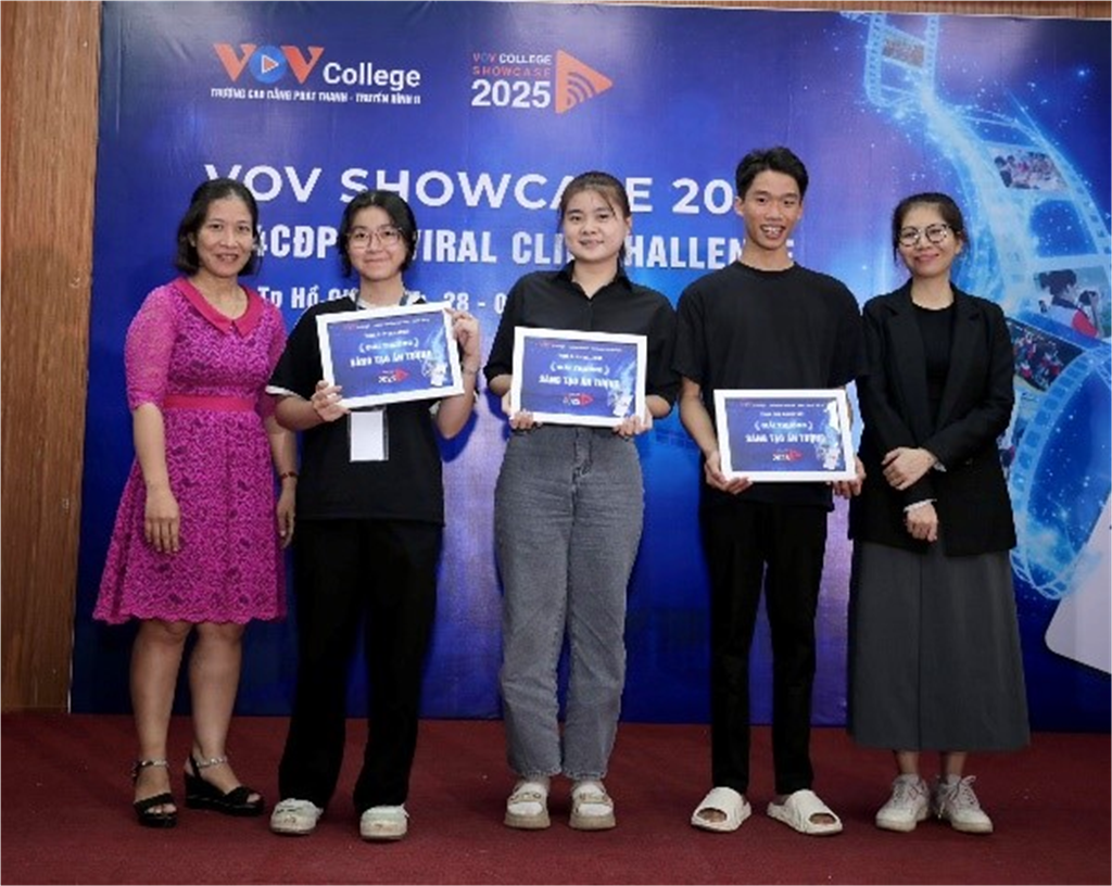 ThS. Nguyễn Thị Vân - Trưởng phòng Công tác sinh viên VOV College (giữa) trao thư cảm ơn cho các đơn vị tài trợ cuộc thi