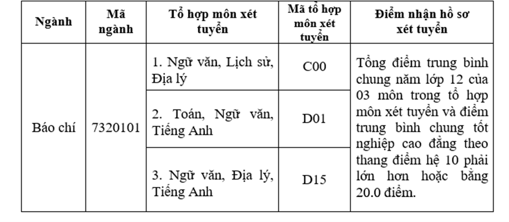 - Tiêu chí xét tuyển: xét tuyển từ cao đến thấp theo tổng điểm trung bình chung năm lớp 12 của 03 môn trong tổ hợp môn xét tuyển và điểm trung bình chung khóa học ngành tốt nghiệp cao đẳng theo thang điểm hệ 10 cho đến khi hết chỉ tiêu (nếu thí sinh tốt nghiệp cao đẳng chỉ có điểm trung bình chung khóa học theo thang điểm hệ 4, thì được quy về thang điểm hệ 10 bằng cách lấy điểm trung bình chung khóa học theo hệ 4 nhân với 2.5).