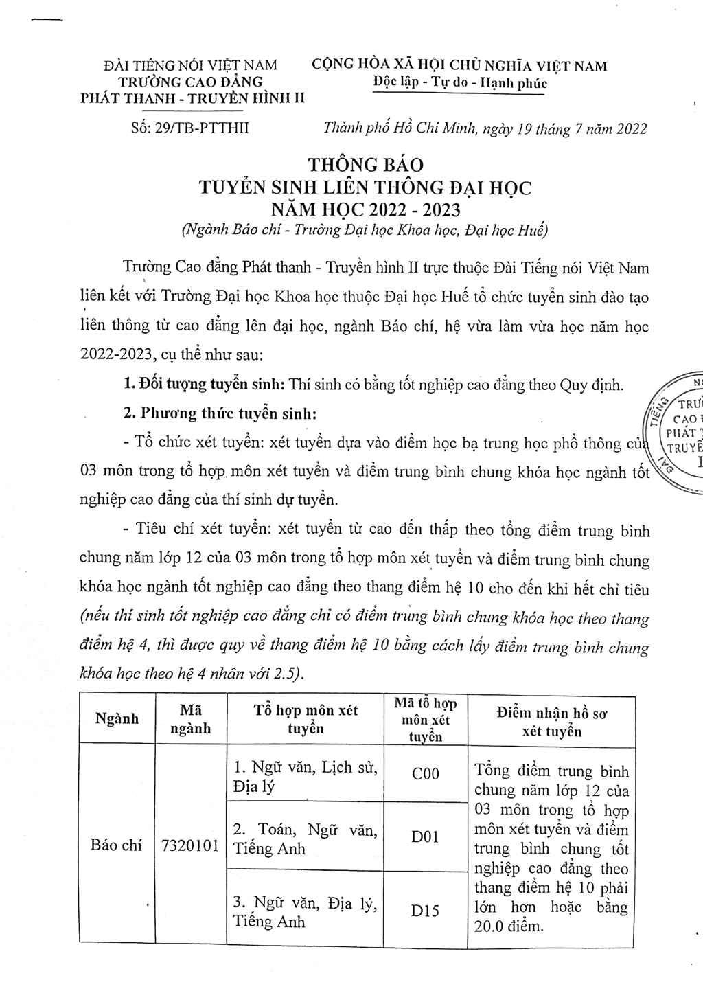 Trường Cao đẳng Phát thanh - Truyền hình II trực thuộc Đài Tiếng nói Việt Nam liên kết với Trường Đại học Khoa học thuộc Đại học Huế tổ chức tuyển sinh đào tạo liên thông từ cao đẳng lên đại học, ngành Báo chí, hệ vừa làm vừa học năm học 2022-2023, cụ thể như sau: