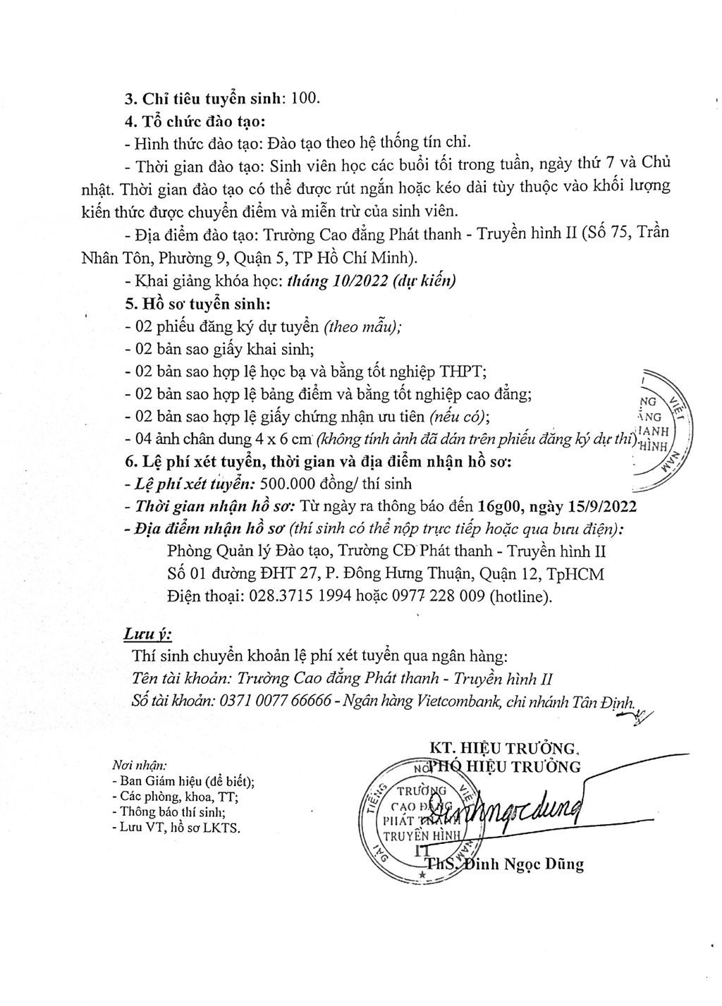 - Địa điểm đào tạo: Trường Cao đẳng Phát thanh - Truyền hình II (Số 75, Trần Nhân Tôn, Phường 9, Quận 5, TP Hồ Chí Minh).